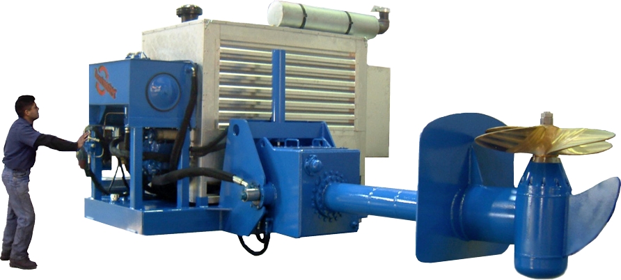 Outboard propulsion units are self-contained thruster packages for main propulsion and positioning of barges, platforms and river craft.